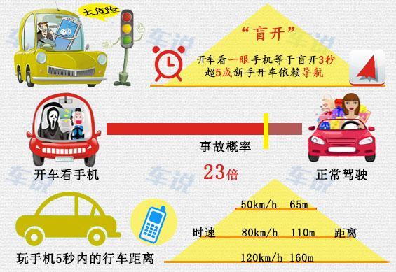 數(shù)據(jù)顯示,開(kāi)車(chē)時(shí)看一眼手機(jī)至少需要3秒,換句話說(shuō),也就是看一眼手機(jī)等于盲開(kāi)3秒,假如車(chē)輛以60千米的時(shí)速行駛,前方遇到緊急情況需要?jiǎng)x車(chē)時(shí),剎車(chē)距離至少是20米,如果邊開(kāi)車(chē)邊看手機(jī),一旦遇到緊急情況,剎車(chē)距離會(huì)變大,后果將不堪設(shè)想。